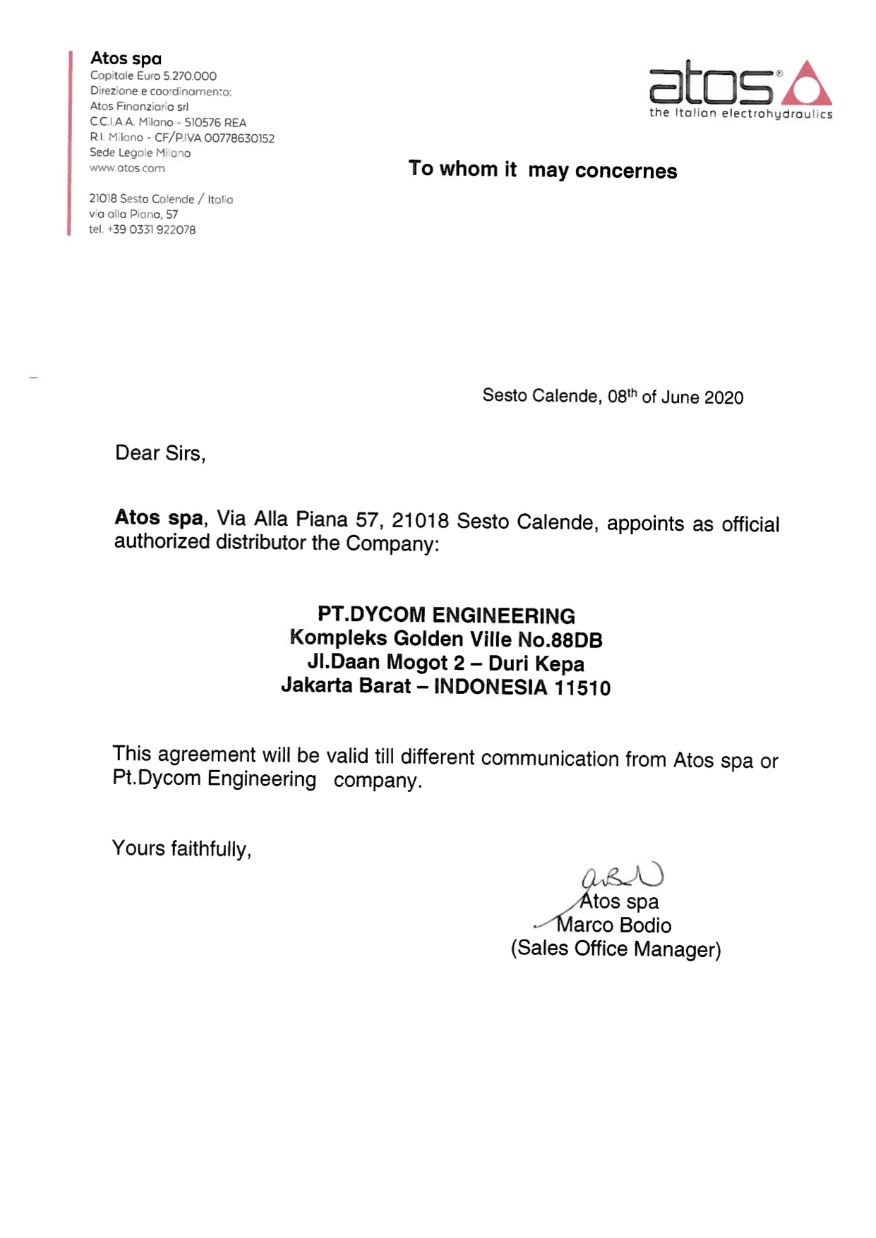 PT. Dycom Engineering is glad to inform that we have been appointed as official distributor of Atos s.p.a, the leading electrohydraulic manufacturer in Italy.